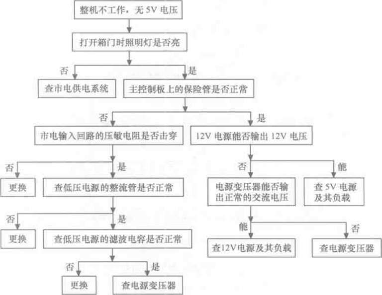 ▲、整機不工作是指插好電源線后壓縮機不運轉(zhuǎn),顯示板上的指示燈或顯示屏也不亮,該故 障主要是由于市電供電系統(tǒng)或主控制板異常所致。該故障根據(jù)有無5V電壓又有所不同,沒 有5V電壓說明市電輸入系統(tǒng)、主控制板上的低壓電源電路異常:若5V供電正常,說明CPU 電路異常。整機不工作.無5V電壓的故障檢修流程如圖8-9所示:整機不工作,有5V電壓 的故障檢修流程如圖8-10所示。
